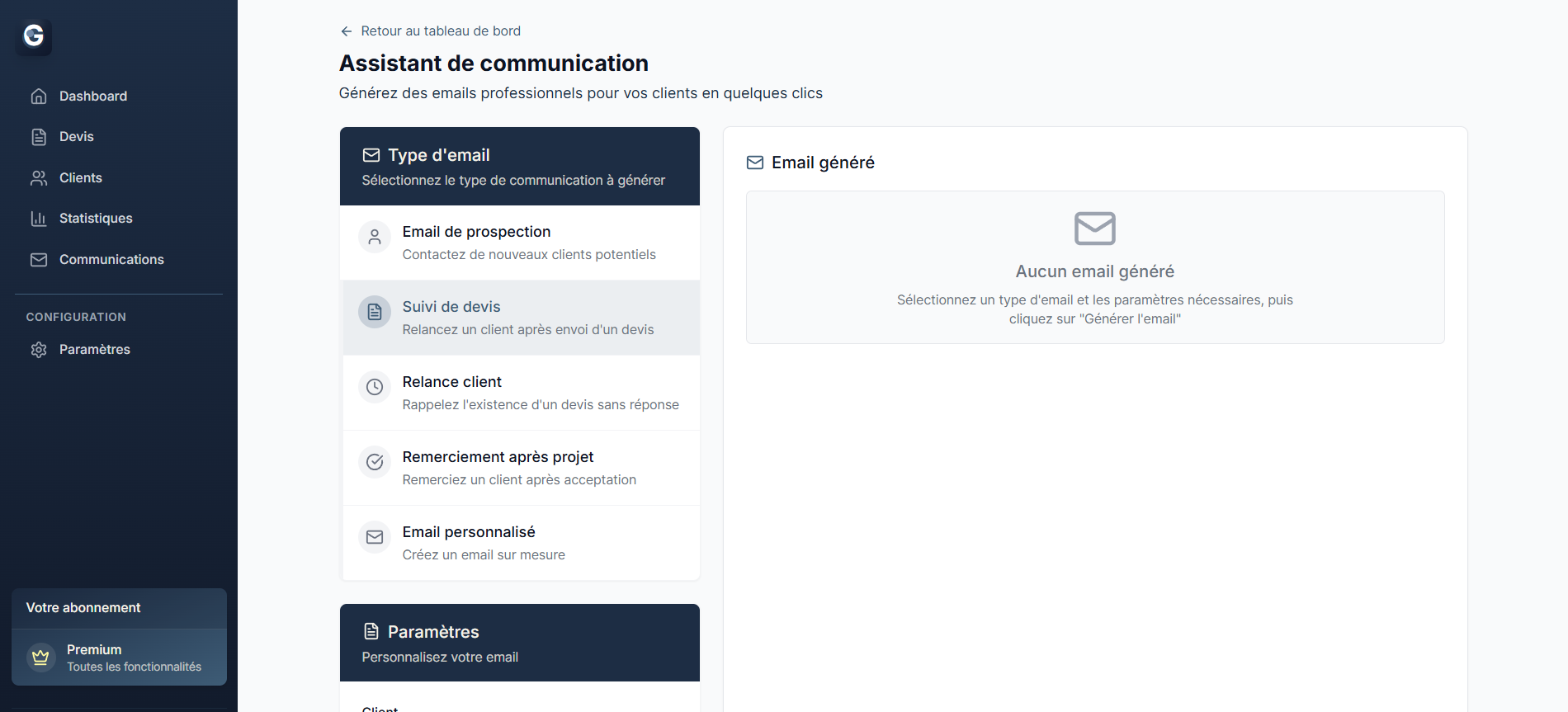 Plateforme SaaS complète de gestion pour indépendants avec génération de devis par IA, conseils personnalisés pour la réussite des missions, gestion clients avancée et outils de communication automatisés.
