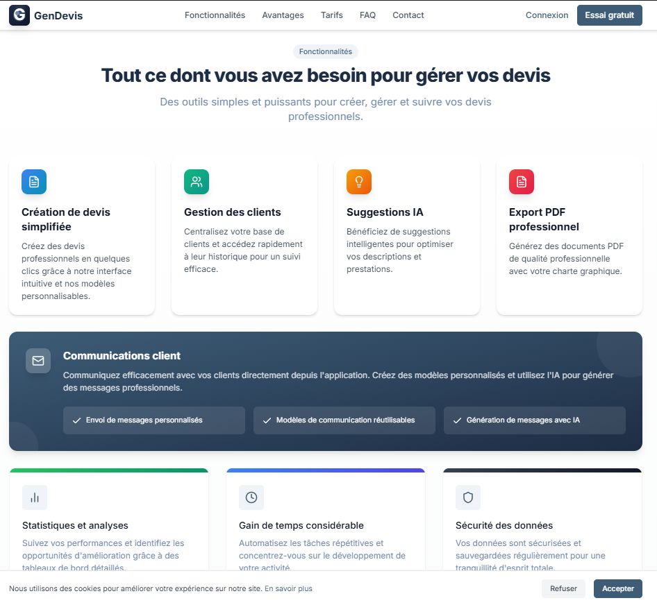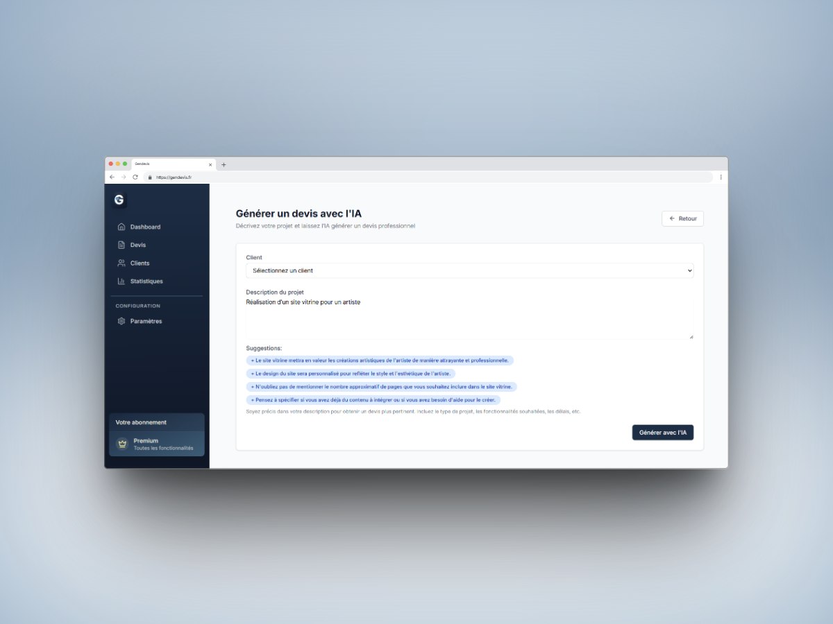 Gendevis révolutionne la manière dont les freelancers gèrent leur activité. En combinant des outils de gestion classiques avec la puissance de l’IA générative, la plateforme permet de gagner un temps précieux sur les tâches administratives et d’augmenter le taux de conversion des devis.