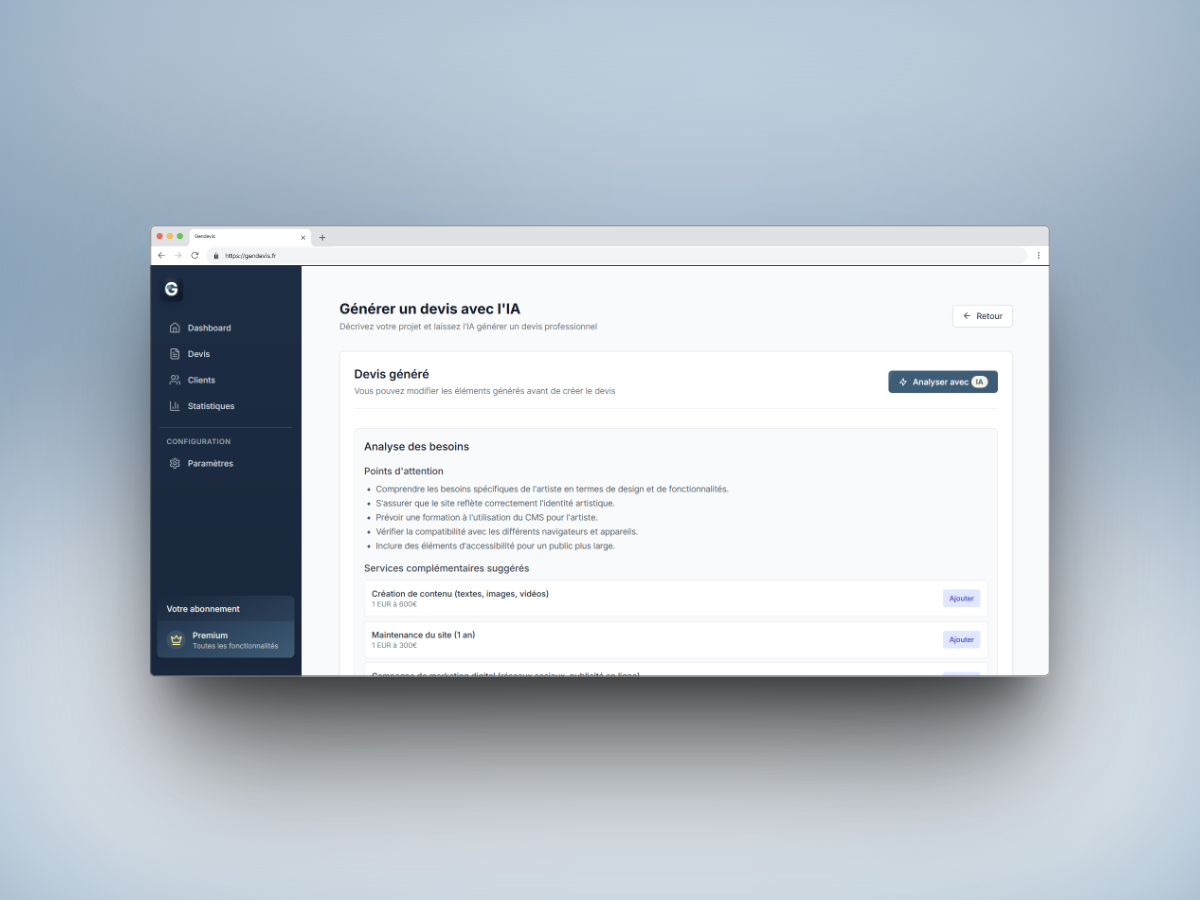 Gendevis révolutionne la manière dont les freelancers gèrent leur activité. En combinant des outils de gestion classiques avec la puissance de l’IA générative, la plateforme permet de gagner un temps précieux sur les tâches administratives et d’augmenter le taux de conversion des devis.