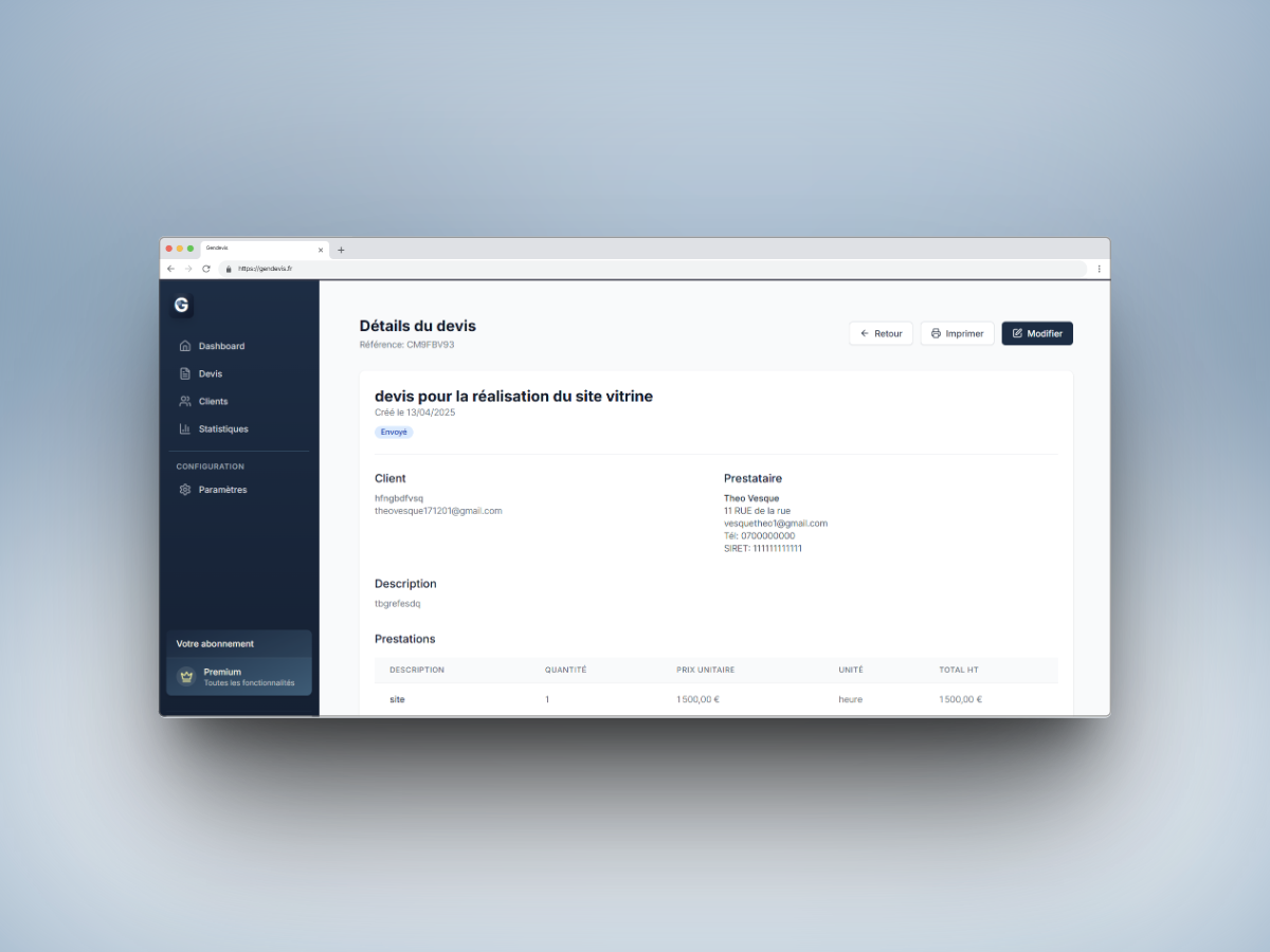 Créer une solution tout-en-un qui simplifie la gestion administrative des indépendants tout en intégrant l'intelligence artificielle pour optimiser la génération de devis et améliorer la communication client. Le défi principal était de développer un système d'IA capable de générer des devis précis et personnalisés selon le secteur d'activité.